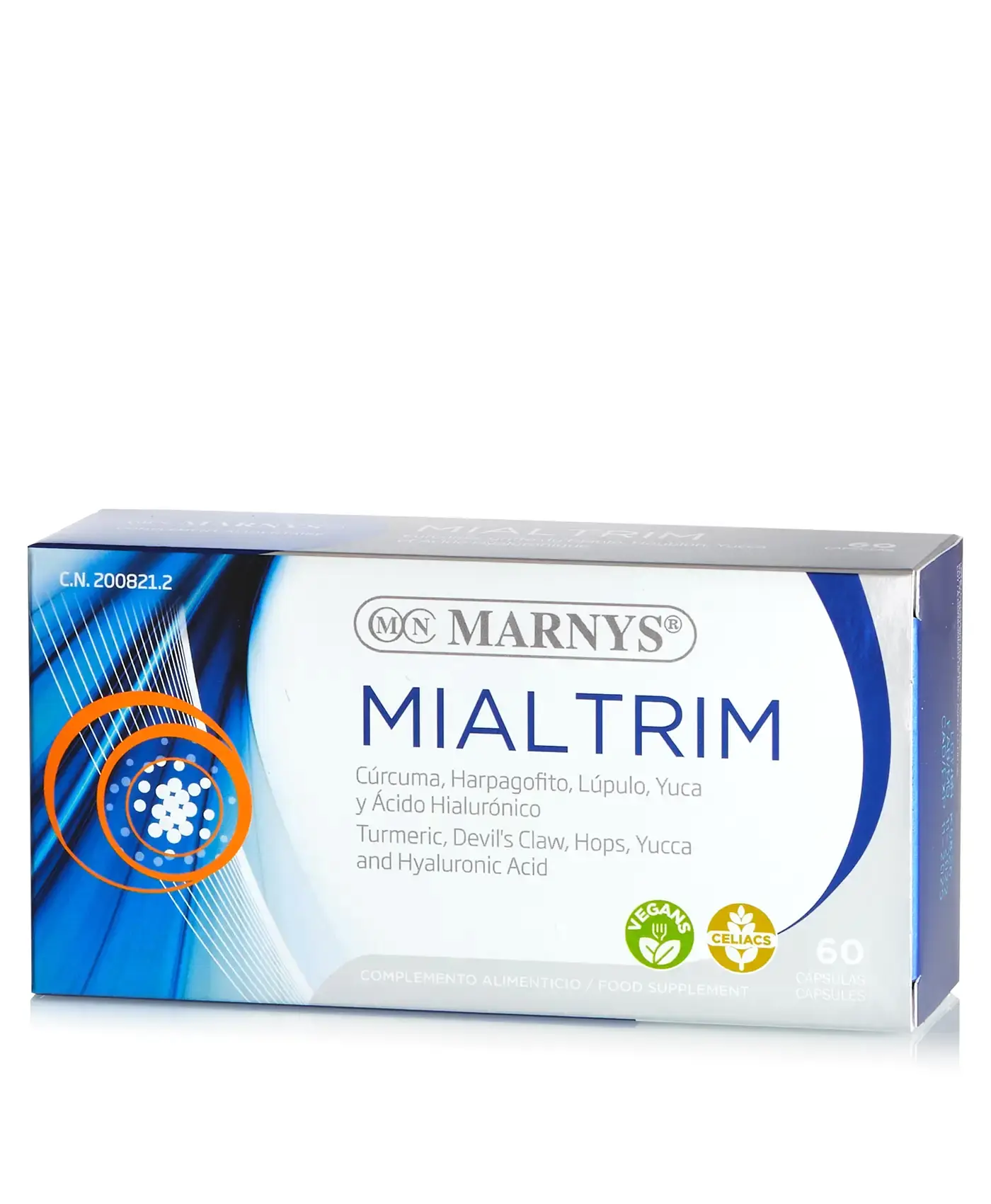 MIALTRIM din gama MARNYS® este un Complex sub formă de capsule vegetale special conceput pentru protejarea sistemului muscular și osteoarticular. Formulă specială cu 7 Ingrediente Active: Hamei, Yucca, Gheara diavolului, Turmeric, Urzică, Acid Hialuronic, fiind îmbogățit cu Vitamina C. Produs în Spania la cele mai înalte Standarde GMP. Nu conține gluten, lactoză sau organisme modificate genetic.